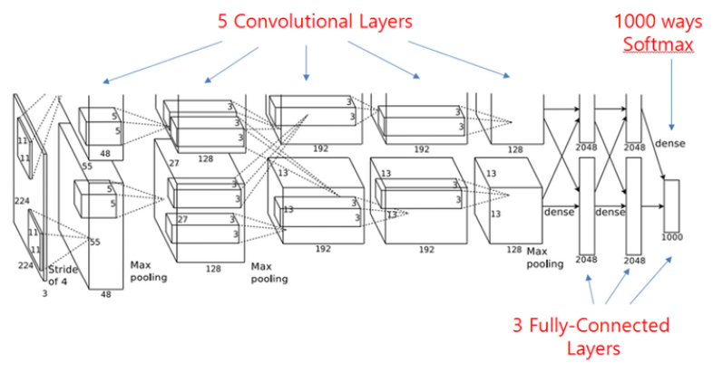 - 5개 Convolutional Layer + 3개 Fully Connected Layer